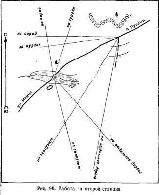 абота на третьей станции. Положение третьей станции было определено засечкой с двух первых станций. Отложив для контроля пройденное расстояние, убеждаются, что положение отдельного дерева определено точно. Затем прочерчивают направление вдоль линии связи на мост (следующая ходовая линия) и контрольные направления на курган и геодезический пункт (сарая не видно).