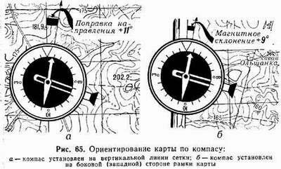 При точном ориентировании карты по компасу вначале указатель отсчета компаса устанавливают против деления шкалы, равного поправке направления, если компас устанавливают на вертикальной линии километровой сетки, или величине магнитного склонения, если компас устанавливают на западную или восточную сторону рамки карты. Если поправка направления (магнитное склонение) положительная (восточное), указатель отсчета устанавливают вправо от нулевого деления шкалы, а если отрицательная (западная)—влево.