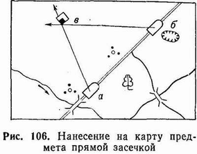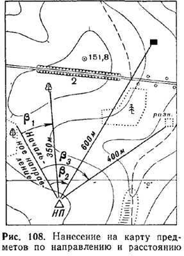 Если по условиям обстановки нет возможности работать с картой непосредственно на точке стояния, то для нанесения на карту предметов, видимых с точки стояния, можно поступить так: