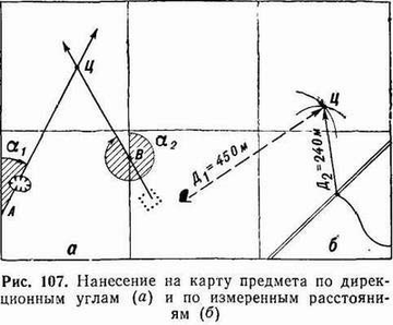 отложив на этих направлениях расстояния до предметов, получают их местоположение на карте.