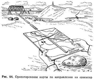 По направлению на ориентир карту ориентируют так ке, как и по линейному ориентиру. Отличие состоит лишь в том, что вместо линейного ориентира используют направление от точки стояния на какой-либо удаленный местный предмет (отдельное дерево, мост, ретранслятор, т. е. точечный ориентир), надежно опознанный на местности и на карте.