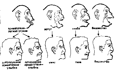 Оскалы и улыбки. У человека они менее выразительны, чем у шимпанзе, из-за ослабления мышц лица.