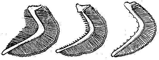 Рис. 1 Жаберные тычинки планктоноядной (а), бентосоядной (б), хищной (в) рыб.