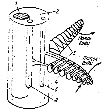1 - хрящевой стержень; 2 - жаберная дуга; 3 - жаберные лепестки; 4 - жаберные пластинки; 5 - приносящая артерия от брюшной аорты; 6 - выносящая артерия к спинной аорте.
