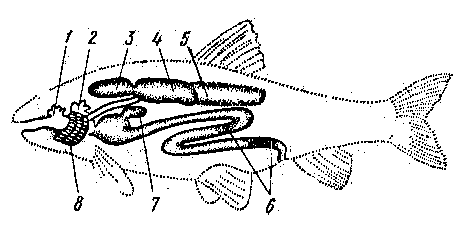 | Рис. 4. Органы водного и воздушного дыхания у взрослых рыб: 1 - выпячивание ротовой полости; 2 - наджаберный орган; 3, 4, 5 - отделы плавательного пузыря; 6 - участки поглощения кислорода в кишечнике; 7 - выпячивание в желудке; 8 - жабры. |