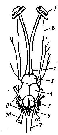 1- обонятельные капсулы; 2- обонятельные доли; 3- передний мозг; 4- средний мозг; 5- мозжечок; 6- продолговатый мозг; 7- спинной мозг; 8,9,10- головные нервы.