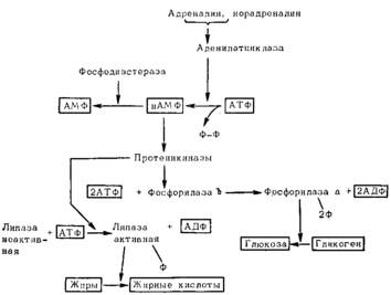 В свою очередь цАМФ активирует большую группу ферментов — протеинкиназ, которые производят перенос фосфатной группы от АТФ на другие ферментные белки, активируя их или снижая их активность. Вот как происходит вызываемое катехоламинами усиление мобилизации источников энергии — глюкозы и жирных кислот (схема 2). Расщепление резервного гликогена в печени и мышцах осуществляется ферментом фосфорилазой, а жиров в клетках жировой ткани — липазой. Но оба этих фермента содержатся в клетках в малоактивном состоянии. Для их активирования необходимо присоединение к их молекулам фосфатной группы от АТФ (фосфо-рилирование), осуществляемое р ротеинкиназами. Катехоламины, активируя аденилатциклазу, приводят к повышенному образованию цАМФ, активирующей протеинки-назы. В результате происходит фосфорилироваине малоактивной липазы, превращающее ее в высокоактивную, а малоактивная фосфорилаза b фосфорилируется и превращается в высокоактивную фосфорилазу а. Сразу же начинается повышенное расщепление гликогена и жиров, и глюкоза с жирными кислотами поступают в кровь. Конечно, все это представлено несколько упрощенно.