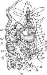 / — трахея, 2 — яремная вена, 3 — сонная артерия, 4 — дуга. аорты, 5 — желудочек сердца, 6 — легкое, 7 — пищевод, 8 — брюшная аорта, 9—желудок, 10—надпочечник, //—почка, 12—яичник, 13— яйцевод, 14 — задняя, полая вена, IS — матка, 16—мочеточник, 17—влагалище, 18 — половое отверстие, 19 — заднепроходное отверстие, 30 — прямая кишка,. 21 — селезенка, 22 — толстая кишка, 23 — тонкая кишка, 24 — поджелудочная железа, 25 — слепая кишка, 26 — печень, 27 — мочеполовой синус