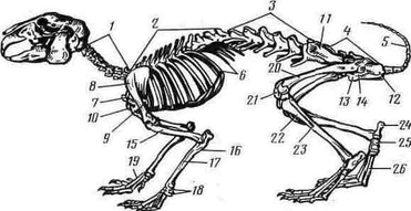 /—шейные позвонки, 2—грудные позвонки, 3—поясничные позвонки, 4—крестец, 5 — хвостовые позвонки, 6— ребра, 7 — рукоятка грудины, 8 —лопатка, 9 — акромиаль-ный отросток лопатки, 10—коракоидный отросток лопатки, //—подвздошный отдел безымянной кости, 12 — седалищный отдел той же кости,. 13 — лобковый отдел той же кости, 14—запирательное. отверстие, 15—плечевая кость, 16—локтевая кость, 17— лучевая кость, 18 — запястье, 19 — пясть, 20 — бедро, ЗУ—коленная чашечка, 22— большая берцовая кость, 23— малая берцовая кость, 24— пяточная кость, 25—таранная кость, 26 — плюсна