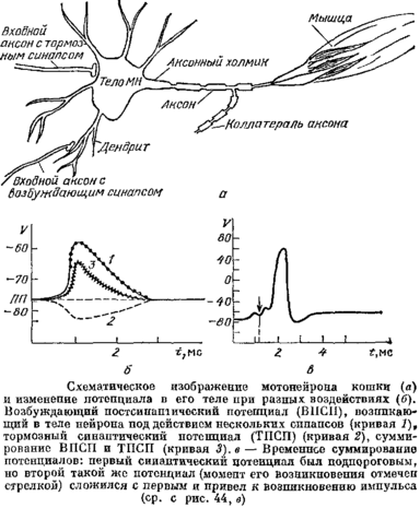 Тело нейрона работает как сумматор потенциалов. Постсинаптические потенциалы — возбуждающие и тормозные, вызванные сигналами других клеток в дендритах МН, передаются по ним как по пассивному кабелю к телу МН и складываются с потенциалами, возникающими прямо в теле. Как только сумма потенциалов станет больше порога мембраны аксонного холмика, в нем возникнет импульс. Этот импульс распространяется по аксону вплоть до его терминалей и через нервно-мышечные синапсы, выделяющие ацетилхолин, возбуждает мышечные волокна. Таким образом, импульс, возникший в МН, вызывает сокращение всех мышечных волокон, на которых оканчиваются веточки его аксона.