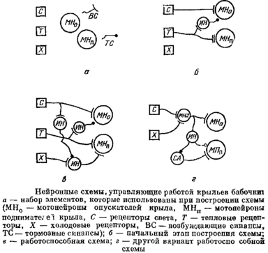 Теперь наша схема будет работать. Для нее нам потребовалось 3 рецептора и 3 интернейрона. Можно сделать схему и экономнее. Например, на рис. 52, г приведена схема, в которой есть вставочный нейрон С А, все время работающий сам по себе. Он будет все время стремиться закрыть крылья, которые будут закрыты всегда, кроме ситуации, когда одновременно работают рецепторы X и С; в этом случае они возбуждают интернейрон ИН 2. Цифра «2» указывает, что его порог так высок, что свет и холод поодиночке не способны его возбудить. Этот интернейрон при возбуждении откроет крылья и затормозит спонтанно активный интернейрон. Вы видите, что в этой схеме мы обошлись всего двумя типами рецепторов. Правда, один из интернейронов в этой схеме обладает более хитрыми свойствами, чем стандартный нейрон: он может работать сам по себе.