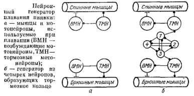 Когда пиявка плывет, в каждом сегменте ее тела поочередно сокращаются то спинные, то брюшные продольные мышцы, так что сегмент выгибается то вверх, то вниз. Сокращение в каждом сегменте возникает немного позднее, чем в предыдущем сегменте. В результате по телу пиявки бежит волна, тело периодически изгибается и пиявка плывет. Как же устроено, что мышцы спины и брюшка сокращаются поочередно?
