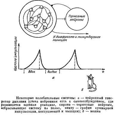 Когда некоторые нейроны этой сети возбуждаются, то в ней начинается цепная реакция, т. е. в последующие моменты времени возбуждается больше клеток, чем в предыдущий, и число импульсов в системе растет подобно тому, как растет число нейтронов в куске урана при ядерной цепной реакции. Кроме того, в сети имеются тормозные клетки с достаточно высоким порогом возбуждения и на них оканчиваются аксоны от возбуждающих нейронов сети. Когда уровень «цепной реакции» становится достаточно высоким, тормозные нейроны срабатывают и затормаживают возбуждающие нейроны, во всяком случае, большинство из них. Но от этого и сами тормозные нейроны замолкают, так как возбуждать их некому, и все начинается сначала. Во время развития цепной реакции происходит вдох, а в то время, когда она заторможена, — пассивный выдох.