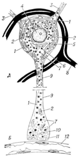 Рис. 1. Строение нейросекреторной клетки (схема): А — тело клетки; Б — терминаль аксона и аксоно-вазальный синапс; 1 — эндоплазматическая сеть и рибосомы; 2 — митохондрии; 3 — дендриты; 4 — ядро клетки; 5 — пластинчатый комплекс; 6 — формирование гранул нейросекрета в пластинчатом комплексе; 7 — зрелые гранулы нейросекрета; 8 — капилляр, оплетающий тело клетки; 9 — аксон; 10 — гранулы нейросекрета; 11 — синаптические пузырьки; 12 — капилляр, в который выделяются нейрогормоны.