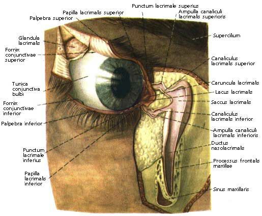 Слезная железа, glandula lacrimalis, дольчатого строения, альвеолярно-трубчатая по своему типу, лежит в fossa lacrimalis лобной кости. Выводные протоки ее, ductuli excretorii, в числе 5-12 открываются в мешок конъюнктивы в латеральной части верхнего свода. Выделяющаяся из них слезная жидкость оттекает в медиальный угол глазной щели к слезному озеру. При закрытых глазах она течет по так называемому слезному ручью, rivus lacrimalis, образующемуся между задними гранями краев обоих век и глазным яблоком. У слезного озера слезы поступают в точечные отверстия, расположенные у медиального конца век. Исходящие из отверстий два тонких слезных канальца, canaliculi lacrimales, обходя слезное озеро, впадают порознь или вместе в слезный мешок.