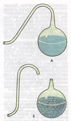 А – в колбе с изогнутым горлышком бульон долгое время остаётся прозрачным (стерильным); Б – после удаления S-образного горла в колбе наблюдается бурный рост микроорганизмов (бульон мутнеет).