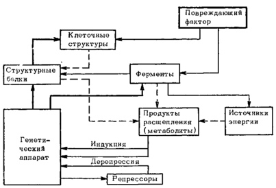 Биохимическая структура всякой клетки и ткани определяется информацией, заложенной в геноме клеток. Качественный состав и величина содержания структурных и ферментных белков определяются геномом, а интенсивность синтеза — условиями существования. В свою очередь состояние ферментных систем и изменения концентрации субстратов и продуктов реакций обмена веществ регулируют расходование и синтез белковых компонентов клетки. Однако в каждый данный момент возможности синтеза как белков, так и небелковых веществ реализуются не полностью. Синтез тех или иных белков может быть ограничен репрессированием определенных участков генома, но может усиливаться в результате дерепрессии или индукции, вызванной повышением функциональной активности клетки или повреждающего ее воздействия. Увеличение расщепления клеточных белков под влиянием изменения условий существования, а также концентрации продуктов обмена веществ, расходование небелковых веществ, снижение их концентрации, вызывая изменения активности ферментов, могут усиливать синтез этих веществ и повышать их концентрацию в клетке. Как видим, повреждающий фактор оказывает влияние на клеточные структуры и ферменты. Первые при этом в той или иной мере нарушаются, а вторые активируются. Под действием ферментов усиливается расходование источников энергии, а освободившиеся из клеточных структур белки в какой-то мере подвергаются расщеплению. Расщепляться при этом могут и сами ферменты. То и другое приводит к возрастанию концентрации метаболитов, которые нередко являются для генетического аппарата индукторами и дерепрессорами, т. е. способствуют отщеплению от гена репрессоров, ограничивающих синтез белков, и запускают процесс синтеза. В результате этого усиливается построение структурных и ферментных белков и восстанавливаются клеточные структуры.