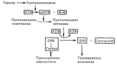 При адаптации организма к условиям среды немалое значение принадлежит гормональной регуляции обмена веществ и физиологических функций. С ролью некоторых гормонов в приспособительных реакциях организма мы уже познакомились, рассматривая гомеостатическое и адаптационно-трофическое действие катехоламинов и пермиссивное значение глюкокортикоидов, участие их в организации общего адаптационного синдрома. Но этим дело не ограничивается. К приспособительным реакциям организма имеют отношение гормоны щитовидной железы, инсулин — гормон островков поджелудочной железы, соматотропный гормон гипофиза, стероидные андрогены, выделяемые корой надпочечников и мужскими половыми железами, и мн. др. Но все они являются не непосредственными деятелями приспособления организма, а регуляторами его молекулярных основ. Они не производят, а способствуют приспособительной реакции обмена веществ, создавая для нее необходимый «фон». Действие гормонов может быть непосредственным, но чаще имеет ряд посредников. Так, вызываемое некоторыми гормонами усиление процесса транскрипции при синтезе белков происходит при участии цАМФ. Как видим, гормон, активируя аденилатциклазу, обеспечивает этим повышение в клетке уровня цАМФ, которая активирует протеипкиназу, перекосящую фосфатную группу от АТФ на гистоны — белки, связанные с ДНК и препятствующие транскрипции. Фосфорилированный гистон, отщепляясь от ДНК, делает транскрипцию возможной.