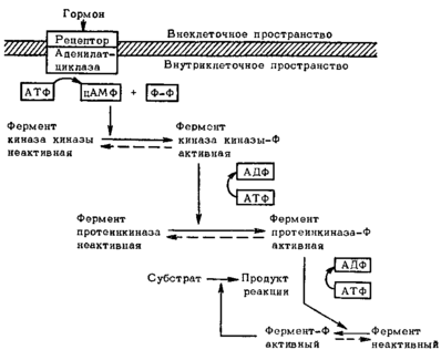 Активация фермента гормоном. Ц — фосфат. Штриховые стрелки — возможность обратимости реакции после прекращения действия гормона и снижения концентрации цАМФ