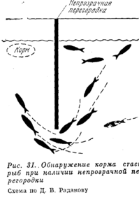 Значение стаи (пли вообще группирования) животных при питании также довольно разнообразно. Прежде всего, в группах животные легче находят скопления пищи. Как показали опыты, проведенные с молодью сайды, та часть рыб из стаи, которая обнаружила корм и бросалась к нему, увлекала за собой других рыб стаи, которые не могли видеть корма (он был от этих рыб скрыт непрозрачной перегородкой), а те в свою очередь увлекали еще более отдаленных сочленов стаи (См. рис3.1) . Таким образом, стадность облегчала рыбе поиск пищи, и в считанные секунды вся стая собиралась на скоплении кормовых организмов, обнаруженных лишь частью ее сочленов.