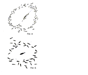 Дезориентация хищника еще более увеличивается в результате особых защитных «маневров» стаи. Эти маневры неоднократно наблюдал и фиксировал Д. В. Радаков киносъемкой для целого ряда морских и пресноводных рыб, как в отношении живых хищников, так и их моделей. «Маневрирование» заключается в том, что при броске хищника на стаю, находящуюся в состоянии кругового обзора, рыбы ближайшей части стаи рассыпаются от хищника веером вперед и в стороны, создавая перед мордой хищника постоянную «пустоту», и, немного проплывая, тут же заворачивают к хвосту хищника против направления его броска. При этом часто стая, разделившись на две части, снова соединяется и следит за удаляющимся хищником. Этот маневр, если его нанести на бумагу, похож на букву Ф, причем путь хищника составляет вертикальную часть этой буквы (см. рис.А). За это сходство называют такой маневр стаи условно «Ф-маневром». Такое маневрирование было зафиксировано для целого ряда рыб в экспериментах в больших бассейнах. Они были отмечены при погоне кефали и морского налима за стаями атерины (Atherina mochon pontica Euch.), саргана (Belone belone (L.)) за стаями хамсы (Engraulis encrasicholus (L.)), ставриды (Trachurus mediterraneus ponticus Aleev), за стаями мальков кефали, щуки, за стаями верховок и в ряде других случаев.