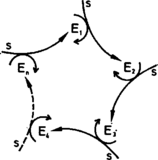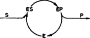 В этом процессе участвуют по меньшей мере три интермедиата: свободный фермент (Е), комплекс фермент — субстрат (ES) и комплекс фермент — продукт (ЕР). Схема показывает, что каталитическое действие фермента эквивалентно циклическому воспроизведению интермедиатов при превращении субстрата (S) в продукт (Р). Впрочем, она дает лишь формальное представление истинного процесса, который может включать в себя многоступенчатую активацию субстрата и индуцированные конформационные изменения фермента.