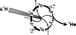 Его компоненты — 12С, 13N, 13С, 14N, 150 и l5N — постоянно воспроизводятся в ходе реакционного цикла. Циклическая схема в целом представляет собой катализатор, который превращает четыре атома 'Н в один атом 4Не с высвобождением энергии в виде Y позитронов (е+) и нейтрино (v).