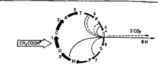 Полная схема цикла была предложена Кребсом, важный вклад в ее построение был внесен также Сеит-Дьёрди, Марциусом и Кнопом. Основные компоненты цикла? цитрат (С), чисаконитат (А), изоцитрат (I), а-кетоглутарат (К), сукцинил-СоА (S*), сукцинат (S), фумарат (F), 1-ма-лат (М) и оксалоацетат (О). Ацетат вступает в цикл в активированной форме в виде ацетил-СоА (этап 1) и реагирует с оксалоацетатом и Н20 с образованием цитрата (С) и СоА (+Н+). Во всех превращениях участвуют ферменты и такие кофакторы, как СоА (этапы 1, 5, 6), Fes+ (этапы 2, 3), NAD+ (этапы 4,5,9), ТПФ, липоевая кислота (этап 5) и FAD (этап 7). На схеме не показаны дополнительные реагенты: Н20 (этапы 1, 3, 8), Pt и QDP (этап 6) и продукты реакций — Н20 (этап 2), Н+ (этапы 1, 9) и QTP (этап 6). В результате всех реакций цикла происходит полное окисление двух ацетильных углеродов до CQ2 (и Н20). За одни оборот цикла генерируется 12 макроэргических фосфатных связей, причем одна из них образуется в самом цикле (QTP, этап 6), а 11—в результате окисления NADH и FADH2 [три пары электронов переносятся к NAD+ (этапы 4, 5,9) и одна пара — к FAD (этап 7)].