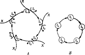 В качестве автокатализатора или — в более общем случае—в качестве каталитического цикла ннтермедиат U способен инструктировать свое собственное воспроизведение, а кроме того, он оказывает каталитическое содействие воспроизведению следующего интермедиата (с использованием высокоэнергетичеекого строительного материала X). Упрощенная схема (Б) показывает иерархию циклов.