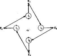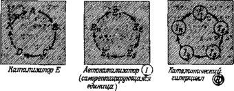 Каждый фермент Е; катализирует воспроизведение следующего носителя информации I;. Он может иметь и другие каталитические свойства, необходимые для осуществления процесса трансляции, метаболизма и т.д. В подобных случаях степень гиперциклической связи больше двух.