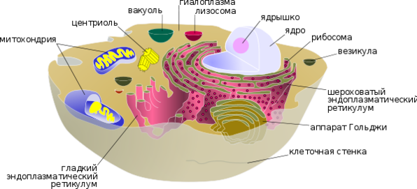 Живое содержимое клетки — протопласт — отделено от окружающей среды плазматической мембраной, или плазмалеммой. Внутри клетка заполнена цитоплазмой, в которой расположены различные органоиды и клеточные включения, а также генетический материал в виде молекулы ДНК. Каждый из органоидов клетки выполняет свою особую функцию, а в совокупности все они определяют жизнедеятельность клетки в целом.