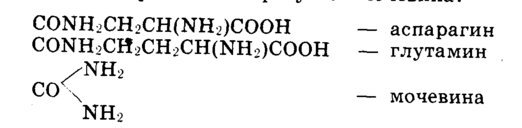 Роль амида, аспарагина, глютамина и мочевины в растении. При восстановлении нитратов, а также при дезаминировании аминокислот (т.е. отщеплении от них аммиака) в растениях может накопляться аммиак, который ядовит для большинства из них. В растении аммиак обезвреживается, так как он связывается аспарагиновой или глутаминовой кислотой, образуя соответственные амиды (аспарагин, глутамин). У многих низших растений образуется мочения: