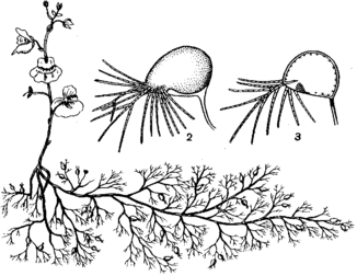 Большой интерес представляет обитающая в болотистых водоемах пузырчатка. Помимо рассеченных листьев, она несет еще характерные пузыревидно измененные листья. В такой пузырек проникают мелкие рачки и уже не могут выбраться наружу, так как створка, сквозь которую проник рачок, открывается в одну сторону.