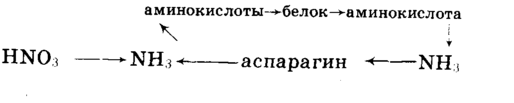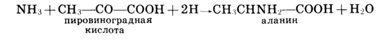 Восстановленный азот нитратов или непосредственно поглощенный ион аммония, соединяясь с продуктами превращения углеводов, образует аминокислоты, а затем белки. Аммиак, реагируя с некоторыми органическими кислотами, может образовать аминокислоты. Так, например, аммиак, реагируя с пировиноградной кислотой, образует аминокислоту аланин: