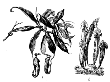 Насекомоядные растения. Большой интерес представляют высшие растения со своеобразным типом азотистого питания. Сюда относятся некоторые сапрофиты, паразиты, полупаразиты и, наконец, насекомоядные растения. Своеобразие азотистого, а у некоторых форм и углеродного питания возникло в процессе эволюции под влиянием условий существования и естественного отбора. Таким образом, в отличие от грибов и бактерий, где гетеротрофное питание азотом имеет первичный характер, у этих растений оно возникло вторично. Наиболее интересную группу растений, питающихся органическим азотом, составляют насекомоядные растения.
