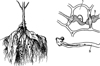 Клубеньковые бактерии. Способность бобовых растений использовать атмосферный азот была доказана опытами немецких ученых Г. Гельригеля и Г. Вильфарта в 1886 г. Им удалось показать, что, посеянные в прогретый песок, в котором убиты все бактерии, бобовые растения, не образующие в этом случае клубеньков, не усваивают (не фиксируют) атмосферный азот, а растут лишь при наличии его в виде сортветственных солей в песке. Впоследствии бактерии были выделены в чистую культуру и названы клубеньковыми бактериями. Оказалось, что, прекрасно развиваясь на питательных средах, клубеньковые бактерии обычно не фиксируют при этом атмосферного азота. Усвоение азота воздуха идет у них беспрепятственно только в симбиозе (сожительстве) с бобовыми растениями.