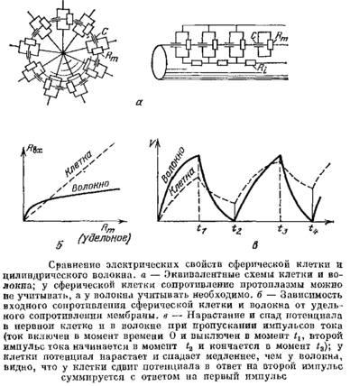 Можно показать, что у сферических клеток, даже у очень крупных, с диаметром порядка 1 мм, сопротивление протоплазмы составляет только 0,1% сопротивления мембраны. У клеток меньших размеров — а таковы все клетки в нервной системе позвоночных — сопротивление протоплазмы можно вообще не учитывать. Так что реально входное сопротивление сферической клетки зависит только от удельного сопротивления ее мембраны и от ее радиуса а: