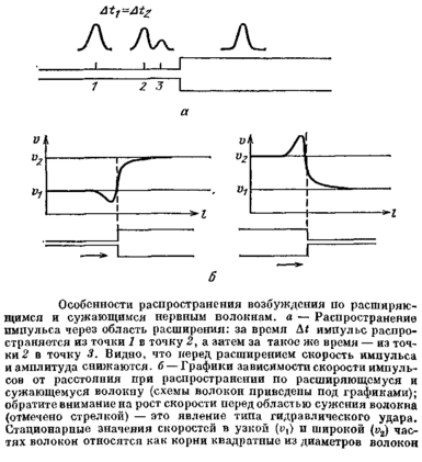 Представим себе, что нервное волокно в некоторой точке резко расширяется. Что произойдет с импульсом, идущим из тонкого участка в толстый? Когда импульс идет по тонкой части волокна, ток, создаваемый возбужденным участком, заряжает мембрану, лежащую рядом с возбужденной областью, и идет по аксоплазме в более удаленные участки. По мере приближения возбужденной области к месту расширения все большая доля тока начинает перетекать в широкую часть волокна — ведь там меньше сопротивление — и меньшая доля тока идет через мембрану невозбужденной области узкого участка волокна. Из-за этого емкость мембраны узкого участка заряжается медленнее, потенциал нарастает медленнее, и импульс замедляет свое движение. Кроме того, снижается и амплитуда импульса, так как при медленном нарастании потенциала успевает инактивироваться часть натриевых каналов.