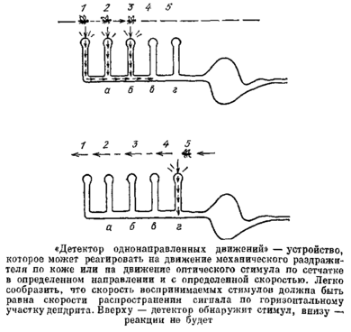 Такое устройство будет возбуждать тело клетки только в том случае, когда стимул движется по сетчатке в определенном направлении и с определенной скоростью; на другие сигналы нейрон отвечать не будет.