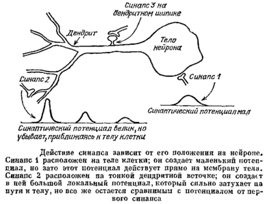Все вышеприведенные рассуждения долгое время носили качественный характер. В 1965 г. в Теоретическом отделе Института биофизики АН СССР был разработан способ количественной оценки эффективности синапсов для нервных клеток любой формы и рассчитана эта эффективность для мотонейронов, пирамидных клеток коры и клеток мозжечка. Оказалось, что эффективность дендритных синапсов всего в 3—5 раз ниже, чем у синапсов, расположенных на теле нейрона. Чем это объясняется? Почему эффективность удаленных дендритных синапсов оказалось довольно велика? Чем меньше клетка, чем выше ее входное сопротивление, тем больший сдвиг потенциала создает синапс. У тоненьких дендритных веточек, удаленных от тела клетки, входное сопротивление оказалось большим, поэтому синапсы могут создавать в этих веточках сдвиги потенциала в десятки раз большие, чем в теле нейронов. И хотя при распространении к телу этот сдвиг потенциала действительно сильно затухает, его большая величина в значительной мере компенсирует затухание. Таким образом, дендритные синапсы оказались вовсе не ошибкой природы.