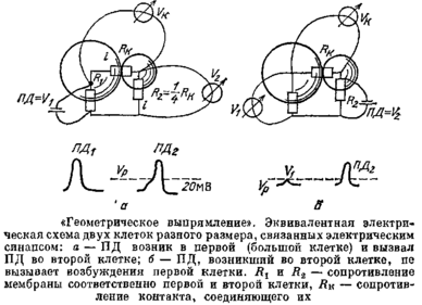Разберем сначала самый простой случай: пусть есть две клетки, соединенные между собой ЭС. Действие ЭС, в отличие от действия ХС, симметрично, И действительно, сам ЭС — это система тонких отверстий, которые совершенно одинаково пропускают ток в обе стороны. А вот действие такого синапса на связанные им клетки может сильно различаться, если эти клетки отличаются по величине, а значит, и по входному сопротивлению.