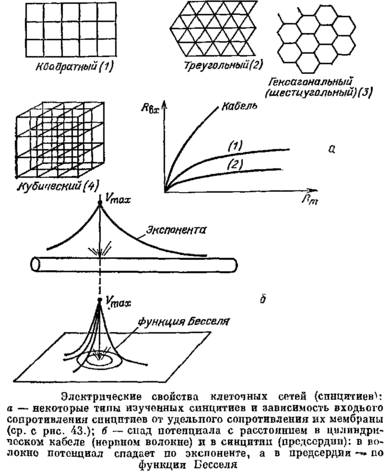 Сравним теперь, как меняется мембранный потенциал в геометрически разных объектах по мере удаления от точечного источника тока. В сферической клетке сдвиг потенциала одинаков в любой точке ее мембраны — она эквипотенциальна. В цилиндрическом волокне потенциал спадает по экспоненте, а в синцитии потенциал спадает гораздо круче, чем по экспоненте; например, спад потенциала в таком почти плоском тонком синцитии, как предсердие лягушки, описывается функцией Бесселя.