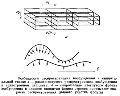 Форма фронта волны в возбудимых средах, как и в случае обычных физических волн, зависит от скорости распространения возбуждения. Если среда изотропна, волны будут круговые. Но скорость возбуждения в синцитии сильно зависит от его геометрии; например, в таком синцитии,, как на рис, 49г а, при распространении в горизонтальном направлении вдоль волокон скорость велика, а при распространении в вертикальном направлении токи в каждом узле ветвления перетекают в длинные боковые перемычки, и это снижает скорость проведения. Расчеты, проведенные на ЭВМ сотрудницей Института проблем передачи информации АН СССР Т.А. Шура-Бура, показали, что за счет такой организации сети скорость возбуждения может быть снижена на порядок. Такой анизотропный синцитий и образует «линию задержки» между предсердием и желудочком.