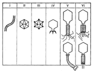 По форме частиц фаги делятся на шесть основных морфологических типов (групп): (рис.2) палочковидные или нитевидные фаги; фаги, состоящие из одной головки, без отростка; фаги, состоящие из головки, на которой имеется несколько небольших выступов; фаги, состоящие из головки и весьма короткого отростка; фаги, имеющие головку и длинный отросток, чехол которого не может сокращаться; фаги, имеющие головку и длинный отросток, чехол которого может сокращаться.