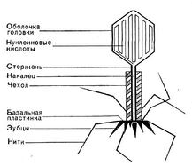 Головки всех фагов состоят из внутреннего содержимого — нуклеиновой кислоты - и окружены белковой оболочкой. Отросток фагов весьма сложен. Он обычно состоит из следующих структур: наружного чехла (или оболочки), внутреннего стержня с канальцем, базальной пластинки, оканчивающейся выступами (типа шипов) и нитевидными структурами. Чехол отростка состоит из субъединиц белковой природы, собранных в спираль. В результате этого он приобретает вид гофрированной трубки. В верхней части отростка многих фагов имеется образование, которое называется воротничком. На рисунке 9 схематически изображена тонкая структура фаговой частицы.