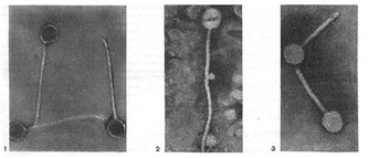 Иллюстрация 7: Разные фаги пятого морфологического типа, частица состоит из головки и длинного отростка, чехол которого не способен сокращаться. 1,2- увел. X 225 000, 3 - увел. X250 000