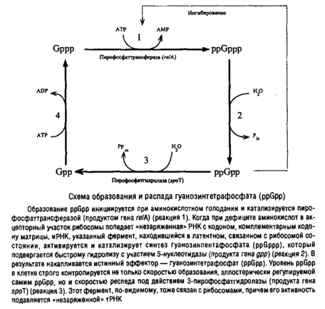 Дефицит энергии также тормозит гидролиз ppGpp, так как активность пирофосфатгидролазы АТР-зависима. Таким образом, при аминокислотном голодании не только стимулируется синтез PpGpp, но и тормозится его гидролиз.