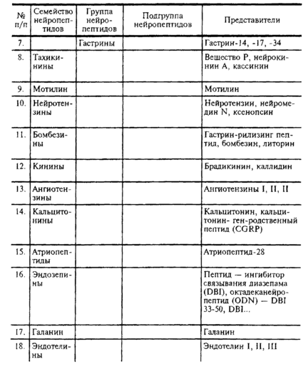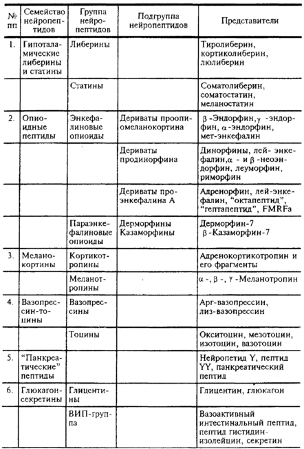 Включает вазопрессины и окситоцины, четко объединяется общностью структуры и преимущественного места секреции — нейрогипофиза. Синтез этих НП происходит главным образом в гипоталамусе, и они представлены в ряде отделов мозга. Вазопрессин давно известен как гормон — дистантный ингибитор диуреза и вазопрессор, а окситоцин —как стимулятор сокращения матки при родовой деятельности. Однако сейчас стало очевидным их участие в формировании долговременной памяти. Дискутируется вопрос о том, является ли это действие прямым или осуществляется через действие на эмоциональное состояние и избирательное внимание. Вазопрессин является при этом стимулятором, а окситоцин — частичным ингибитором.