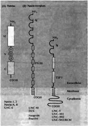 | Рис. 8. Роль нетрина и его рецепторов в аттракции и отталкивании на большом расстоянии. (А) N-концевая аминокислотная часть секреторного белка нетрина состоит из доменов VI и V, которые гомологичны доменам аминокислотного конца 7 цепи ламинина. Домен V содержит три ECG-повтора. С-концевой домен этой цепи не имеет гомологии с ламинином. (В) Рецепторы нетрина имеют внеклеточный домен, однократно пересекающий мембрану, и внутриклеточный домен. Внеклеточный домен семейства DCC рецепторов нетрина имеет четыре иммуноглобулиновых домена (Ig) и шесть повторов фибронектина III (FN III). DCC и их гомологи также могут играть роль молекул адгезии. Семейство рецепторов к нетрину UNC-5 имеет два иммуноглобулиновых домена и два домена, гомологичных тромбоспондину 1-го типа (TSP I), которые расположены внеклеточно, а также длинную цитоплазматическую последовательность. (С) Микрофотографии кусочков дорзального спинного мозга эмбрионов крысы (сверху на каждой из панелей), культивированных вместе с кусочками ткани базальнои пластинки (слева), вместе с CDS клетками, секрета рующи ми рекомбинантный нетрин 1 (в центре), и с контрольными COS клетками (справа). Нижняя пластинка и нетрин 1 оба способны вызывать значительный и направленный рост пучков комиссуральных аксонов из дорзаль ной области спинного мозга. |