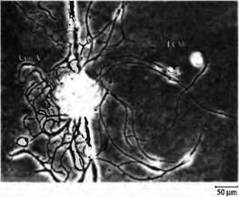 | Рис. 5. Молекулы внеклеточного матрикса определяют паттерн роста нервных отростков в культуре нейронов пиявки. Одиночный нейрон выращен в клеточной культуре на субстрате определенного паттерна. С левой стороны край чашки был покрыт конканавалином A (Con A), а с правой стороны экстрактом, содержащим внеклеточный матрикс (ЕСМ) из глиальных капсул ганглиев пиявки. |